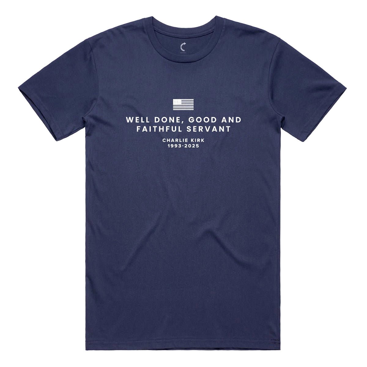 Commemorate Charlie Kirk with the Faithful Servant Tee, featuring the American flag and tribute message. Made from premium cotton for comfort and durability, this unisex memorial shirt is available in sizes S–3XL.