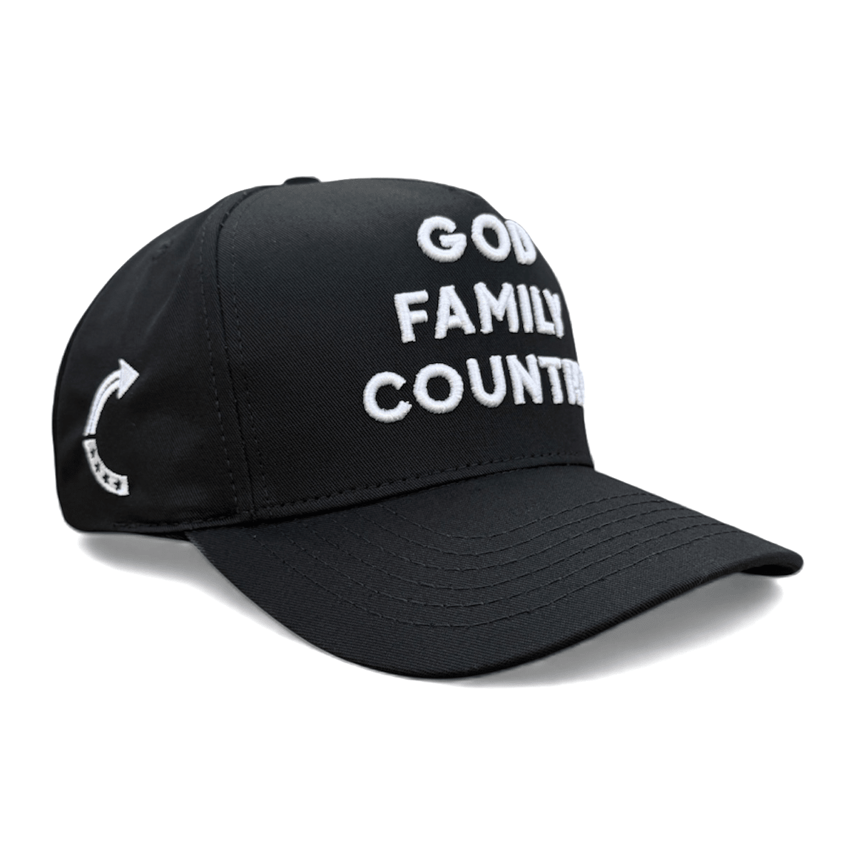 Built for those who stand on principle. This premium black cap features bold puff embroidery on the front reading God. Family. Country. — a raised, dimensional stitch that makes a statement without saying a word. Finished with subtle side details including a tonal American flag and embroidered accent, this hat is designed to be worn daily and last for years.